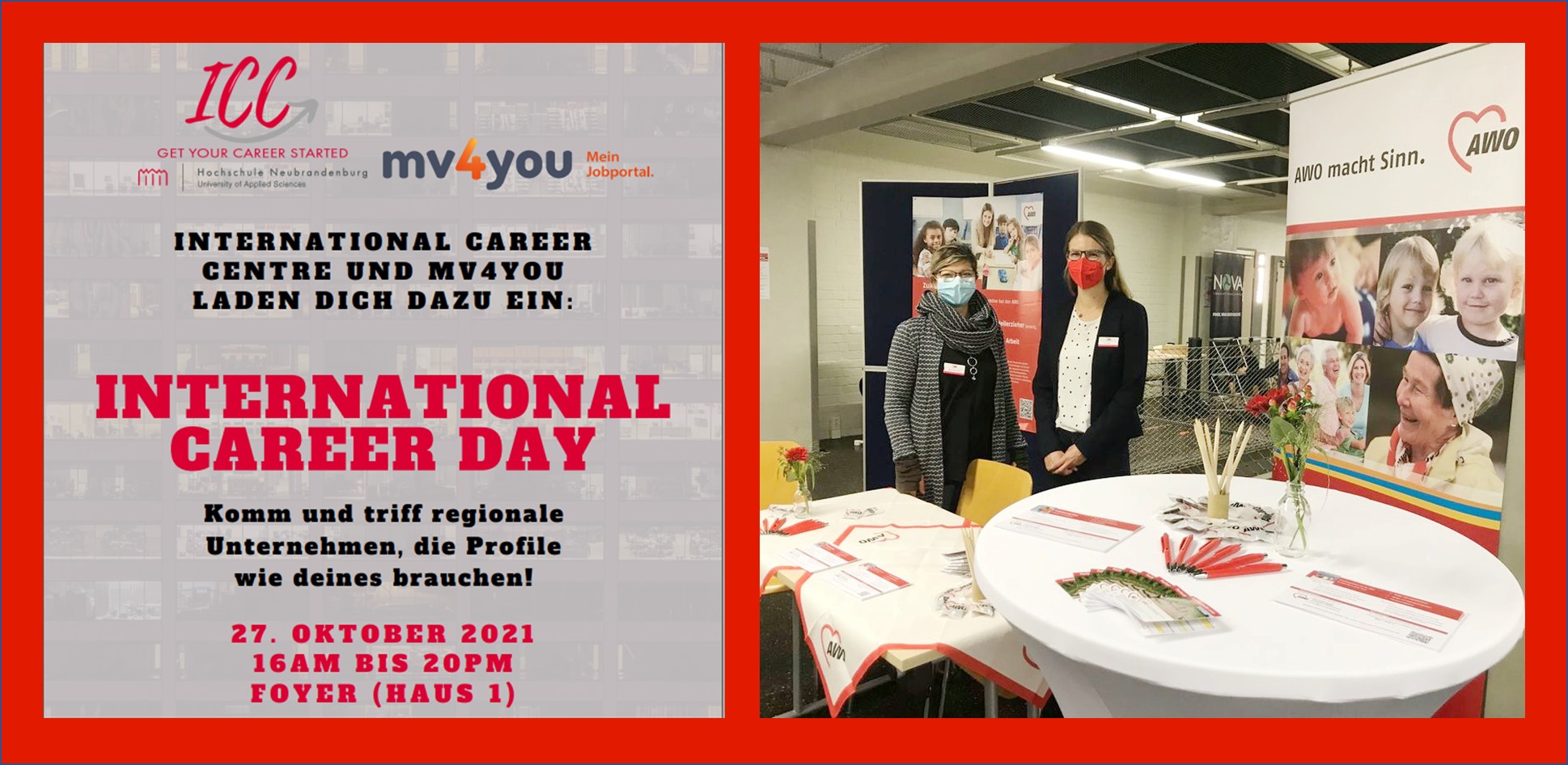 Am 27. Oktober findet in der Zeit von 16:00 bis 19:30 Uhr der „International Career Day“ an der Hochschule Neubrandenburg statt. Die Karrieremesse wurde vom „International Career Centre“der Hochschule Neubrandenburg zusammen mit dem MV4YOU- Netzwerk ins Leben gerufen, um regionale Unternehmen mit jungen angehenden Akademikern aus aller Welt in Kontakt zu bringen und sie so professionell beim Berufseinstieg und auf der Suche nach Praktikumsplätzen zu unterstützen.