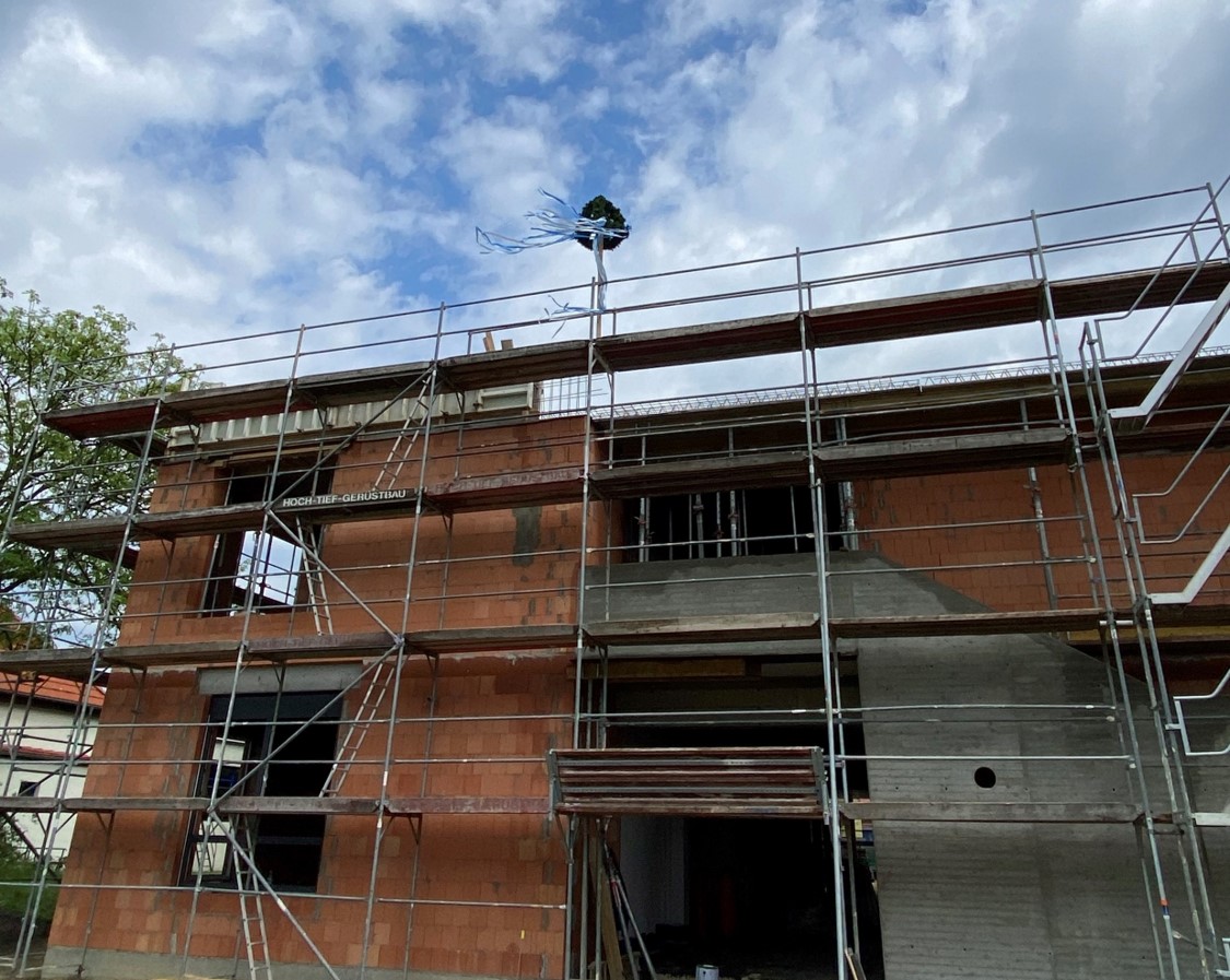 Richtkrone auf dem Dach des zweistöckigen Ersatzneubaus der Kita "Spielkiste".
