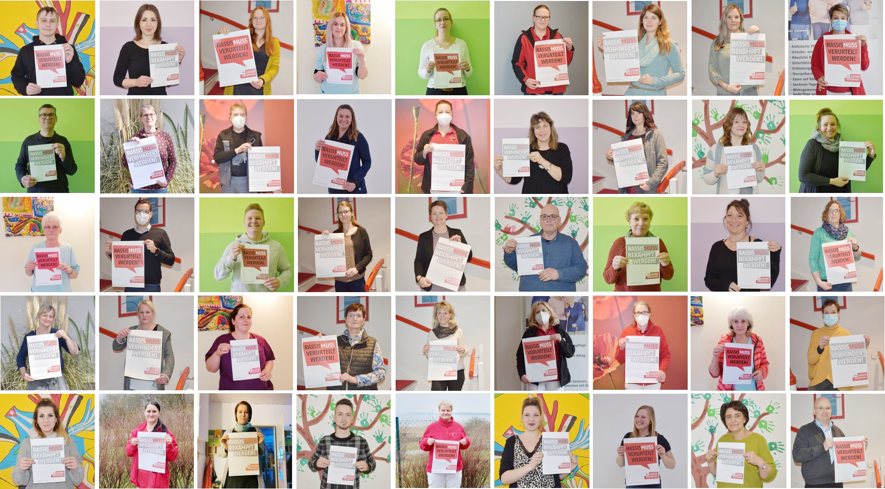 Mitarbeiterinnen und Mitarbeiter der AWO-Vorpommern positionieren sich gegen Rassismus.