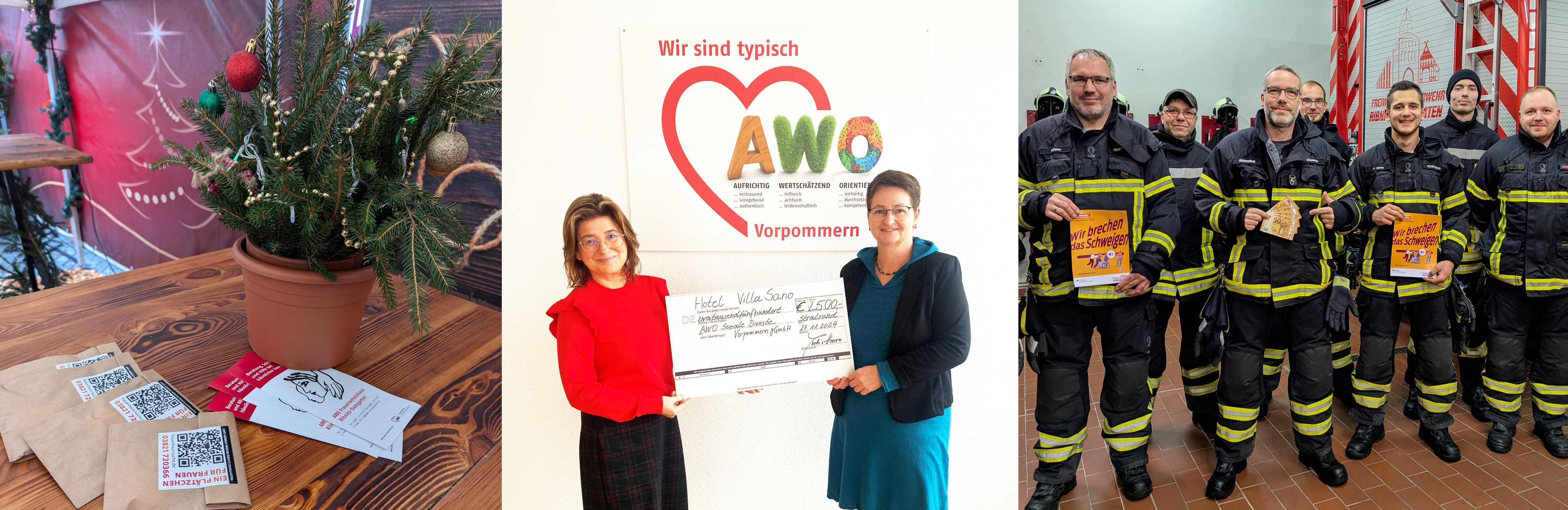 Außerdem gilt ein besonderes Dankschön den SchülerInnen der Bernsteinschule, den JugendsozialarbeiterInnen von JAM GmbH und Herrn Roßbach als Vertreter des Weißen Rings, die ihre Einnahmen unserem Frauenschutzhaus gespendet haben, sowie Frau van Hoorn, Hoteldirektorin der Villa Sano, und dem Verein der Freiwilligen Feuerwehr Damgarten, die unser Frauenschutzhaus ebenfalls mit großzügigen Spenden unterstützen.