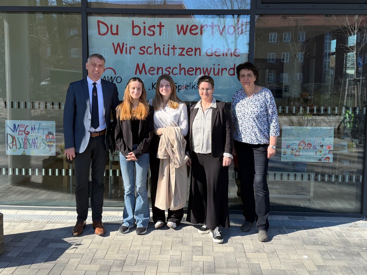 Am 03. April besuchten Alisa Wiemann vom Ernst-Moritz-Arndt-Gymnasium in Bergen und Rieke Koglin, Schülerin des Hansa Gymnasiums in Stralsund, gemeinsam mit dem Landrat des Landkreises Vorpommern-Rügen unsere Stralsunder Kita „Spielkiste“. Im Rahmen des diesjährigen Girls‘ Days begleiteten die beiden Schülerinnen als Landrätinnen für einen Tag Dr. Stefan Kerth auch bei seinen offiziellen Terminen. Ein Außentermin führte die Gruppe in unsere Stralsunder Kita „Spielkiste“, die im Mai 2022 in den lichtdurchfluteten Neubau in der Karl-Marx-Straße 13 gezogen ist. Vor Ort wurden der Landrat und die Schülerinnen von Einrichtungsleiterin Anke Hack und unserer Geschäftsführerin Dr. Catrin Dohse durch das neue Gebäude mit der einladenden Mensa, den großen Spielfluren und der modernen Lehrküche geführt. Während des Rundgangs durch die Kita konnten die Schülerinnen einen intensiven Einblick in die enge Zusammenarbeit zwischen Landkreis, Kitas und deren Trägerorganisationen gewinnen und auch selbst Fragen stellen. Die Achtklässlerinnen waren begeistert von den vielen Eindrücken aus dem Alltag in einer Kindertagesstätte, die sie während der Gespräche und des Rundgangs gewinnen konnten.