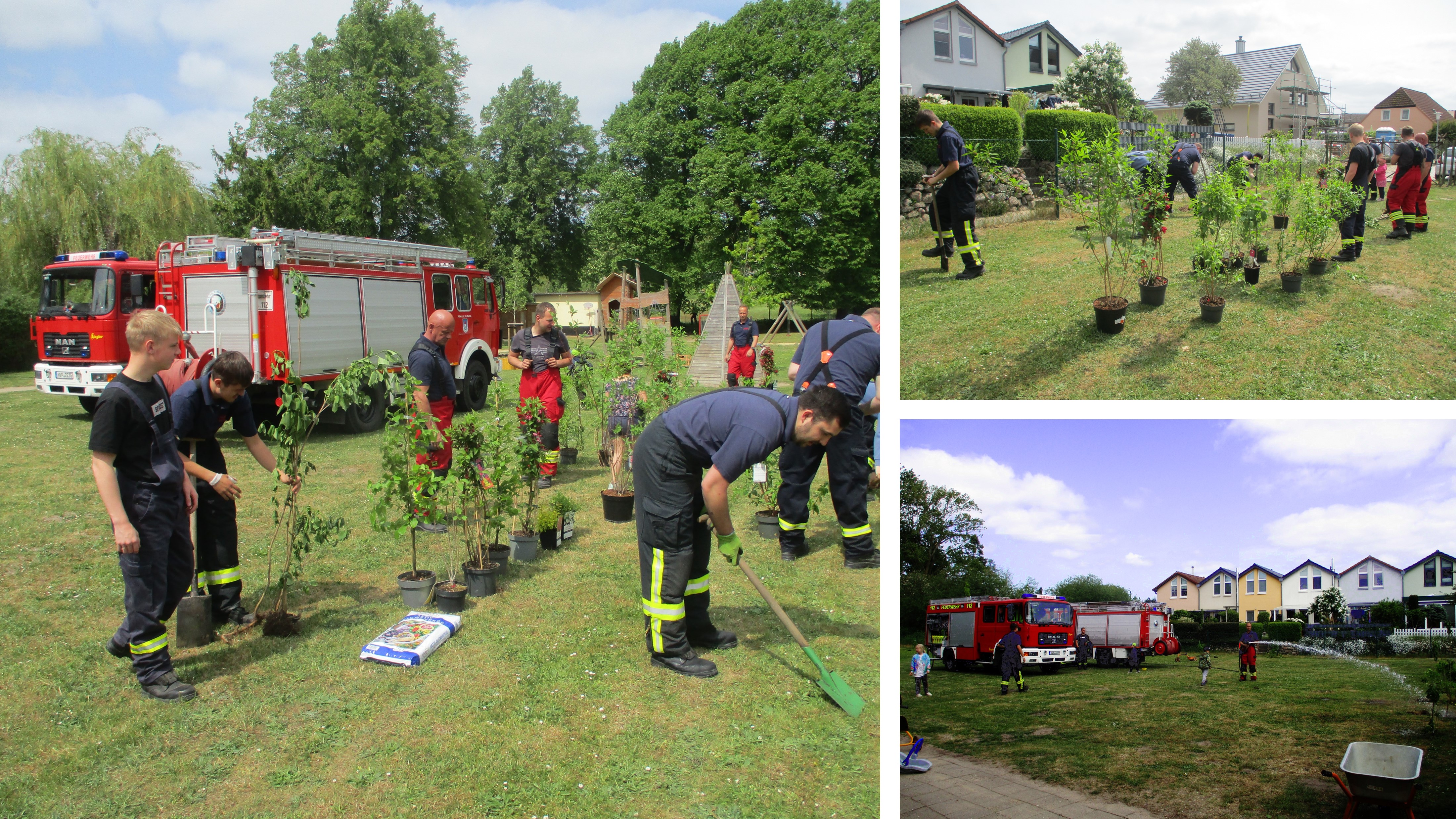 Dank großzügiger Spenden des Fördervereines der Freiwilligen Feuerwehr Richtenberg e.V. und der Firma ITG Ingenieur-, Tief- und Gleisbau GmbH konnte unsere Richtenberger Kita „Sonnenschein“ zahlreiche Pflanzen kaufen, um eine Hecke auf dem Kitagelände zu pflanzen. Initiiert durch den Elternrat der Kita und unterstützt von Mitgliedern der Freiwilligen Feuerwehr aus Richtenberg wurden unter anderem Forsythien, Flieder und Weigelien gepflanzt. Viel Spaß hatten die Kinder besonders beim Gießen der eingepflanzten Blühsträucher. Gemeinsam mit den Feuerwehrmännern bewässerten die Kinder die Jungpflanzen mit dem Schlauch des Einsatzwagens. Auch jetzt, wo es so trocken ist, müssen die Kinder fleißig weiter gießen, damit die Hecke gut anwächst. Wir sagen Danke an alle Helfer und Spendengeber, die dazu beigetragen haben, den-Hof unserer Kita zu verschönern.
