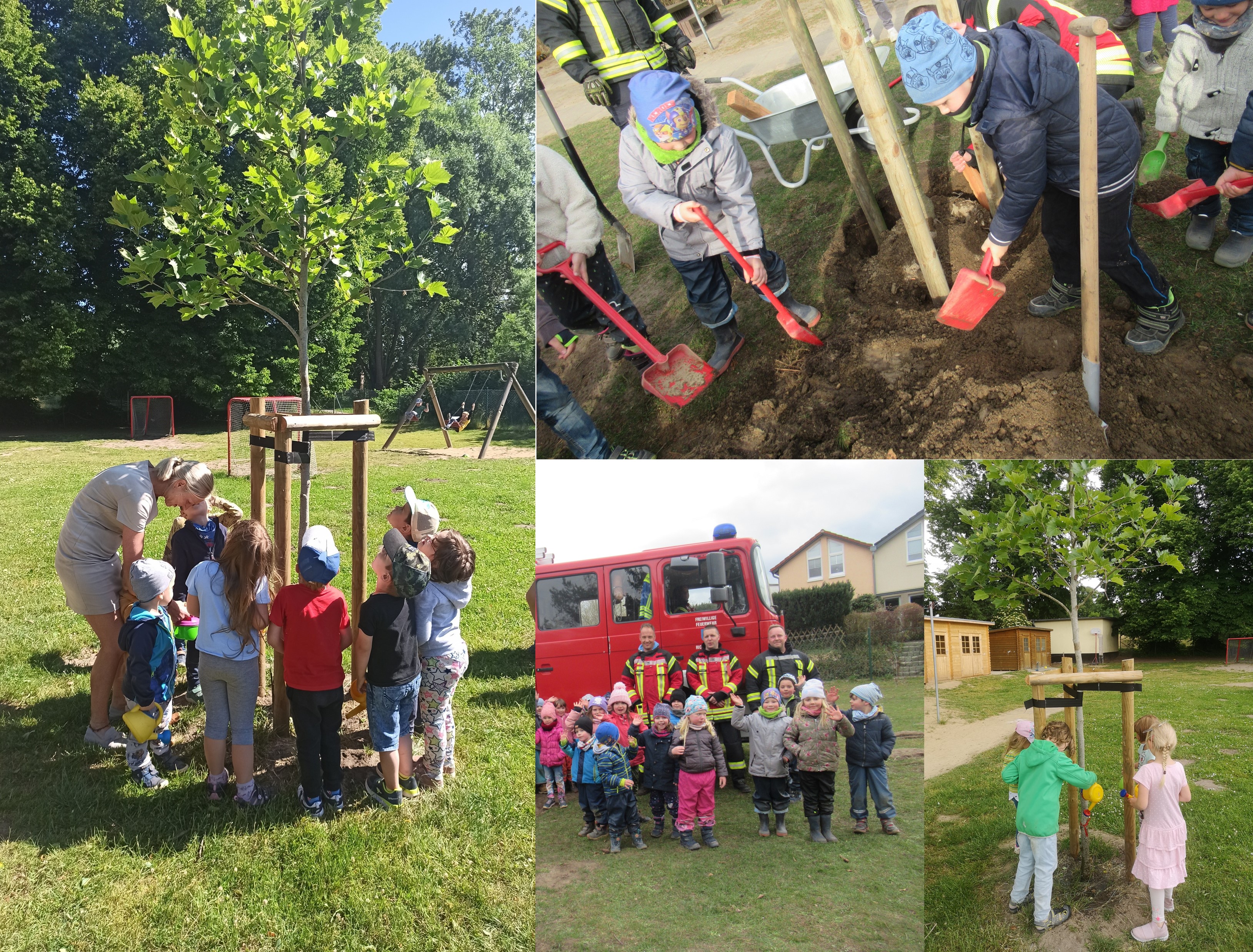 Die Ankunft der neuen Bäume im April wurde von den Kindern aufgeregt erwartet. Beim Einpflanzen erhielten die Junggärtner auch tatkräftige Unterstützung von der Freiwilligen Feuerwehr der Stadt Richtenberg. Zur Freude der Kinder war die Feuerwehr mit einem großen Einsatzfahrzeug vor Ort, das mit passendem Arbeitsmaterial und Werkzeug ausgestattet war, um die notwendigen Aushubarbeiten vorzunehmen. Anschließend bewässerte die Feuerwehr gemeinsam mit den Kindern und dem großen Feuerwehrschlauch die frisch gepflanzten Bäume. Mittlerweile sind die jungen Bäume auf dem Hof der Kita gut angewachsen und die Kinder beobachten gespannt, wie sich die kleinen Bäume entwickeln und die Zweige und Blätter wachsen. Damit die neuen Bäume auch weiterhin gut gedeihen, schauen die Kinder regelmäßig nach den Bäumchen und helfen, wenn es notwendig ist beim Gießen. An dieser Stelle möchten wir, die AWO Kita „Sonnenschein“ Richtenberg, uns herzlichst bei allen Beteiligten bedanken, die uns bei diesem Projekt so fleißig unterstützt haben. Vielen lieben Dank!