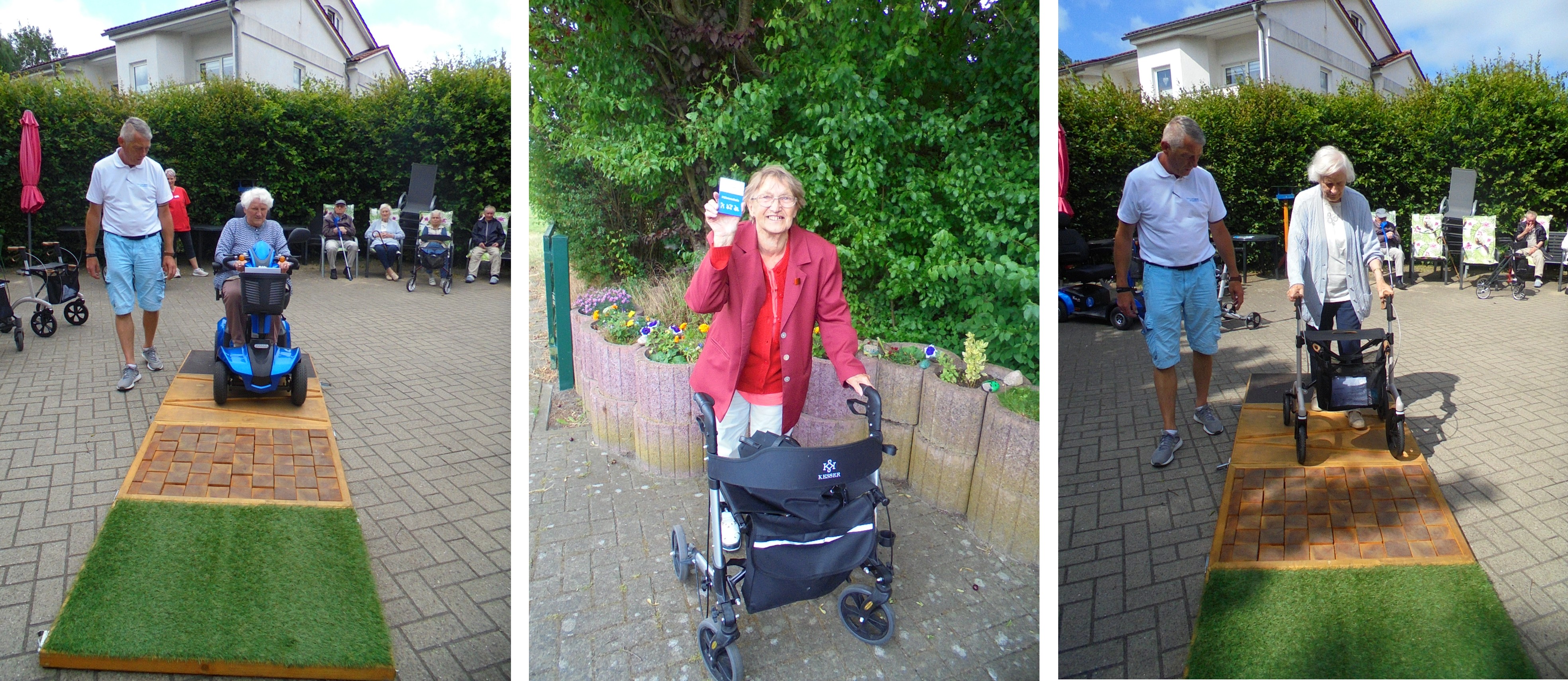 Am 28. Juni konnten sich die Seniorinnen und Senioren aus unserer Tagespflege in Tribsees über verschiedene technische Hilfsmittel zur Mobilitätserhaltung im Alter informieren. Auf aufgebauten Parcours hatten die Tagesgäste und unsere Mitarbeiterinnen die Möglichkeit verschiedene Rollatoren, einen E-Scooter und einen elektrischen Rollstuhl auf unterschiedlichen Oberflächen auszuprobieren und zu testen, wie sich das ein oder andere Gerät in der Handhabung anfühlt. Für die getesteten Hilfsmittel konnten sich die SeniorInnen einen „Führerschein“ ausstellen lassen, was allen viel Spaß gemacht hat. Passend zum schönen Wetter wurde nebenbei gemeinsam gegrillt. Vielen Dank an das Team der Rehaform Niederlassung in Stralsund für diesen spannenden Einblick in die verschiedenen technischen Hilfsmittel und für die spendierte Bratwurst.