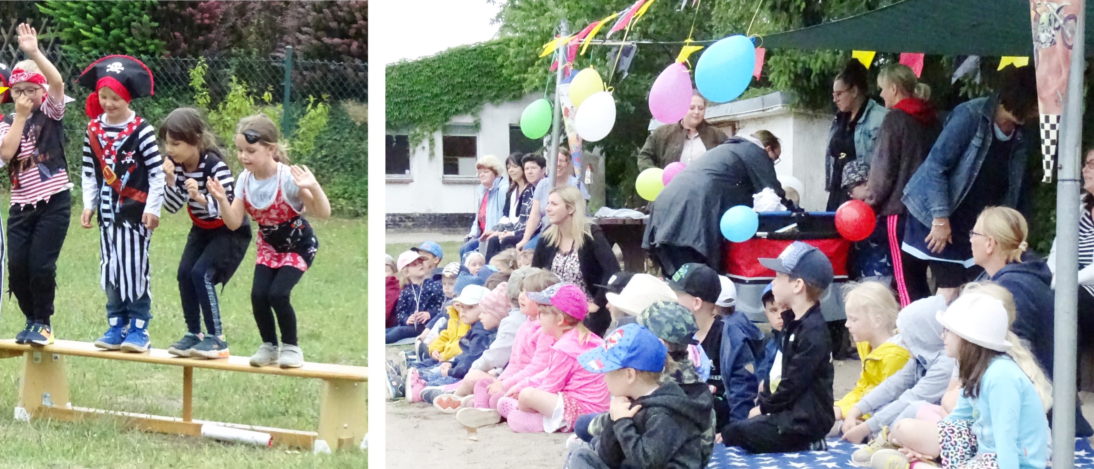 So schnell vergeht die Kindergartenzeit und aus Kitazwergen werden Vorschulkinder und schließlich Erstklässler mit großem Schulranzen auf dem Rücken. Am 28. Juni verabschiedete das Team um Einrichtungsleiterin Marie Blieffert die Vorschulkinder aus der Kita „Sonnenschein“ mit einem gemeinsamen Programm aus allen Kitagruppen. Besonders stolz zeigten die Vorschulkinder dem Publikum den Piratentanz, den sie gemeinsam in ihrem wöchentlichen Tanzkurs mit Frau Bähr vom Perform[d]ance E.V. aus Stralsund einstudiert hatten. Zum Abschied erhielt jedes Vorschulkind sein persönliches Portfolio, mit allen Erinnerungen an die schöne Kindergartenzeit und eine prall gefüllte Zuckertüte. Als besondere Überraschung stand für die Kinder eine Hüpfburg bereit, auf der sich die Kinder nach Herzenslust austoben konnten. Bei Kaffee und Kuchen und mit einem abwechslungsreichen Buffet feierten die Kinder mit ihren Eltern und Erzieherinnen bis in den Abend. Wir wünschen allen Kindern eine wunderschöne Sommerzeit und unseren angehenden ABC Schützen einen tollen Start in den neuen Lebensabschnitt als Schulkind.